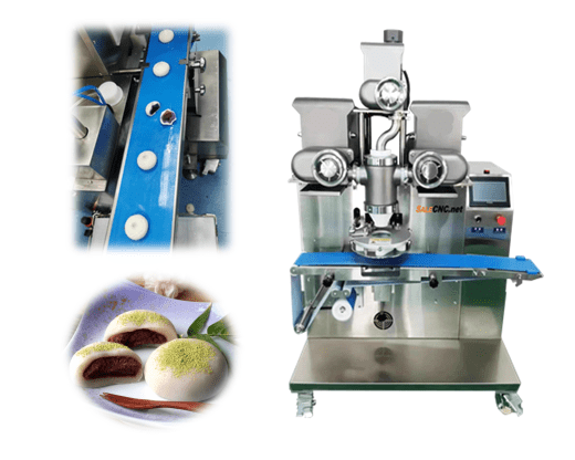 - เครื่องปั้นโมจิใส่ไส้อัตโนมัตินี้ใช้การนวดแบบเกลียว จากนั้นอัดขึ้นรูปทรงกรวยแนวตั้ง ผลักดันด้วยพื้นผิวแรงขับสกรู และมีปั๊มดูดช่วยใส่ไส้ตรงกลางแป้ง